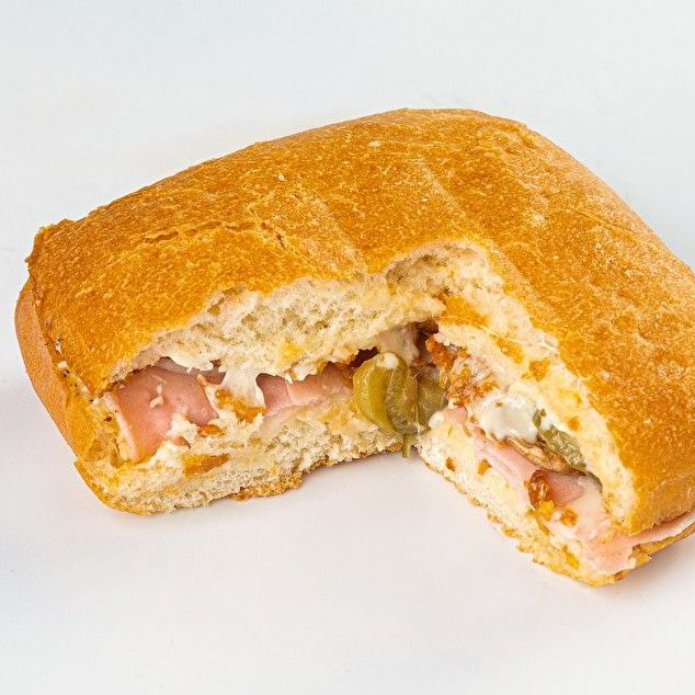 Заказать Чиабатта, сыр моцарелла, ветчина, шампиньоны, огурец маринованный, лук карамелизированный, соус чесночный.