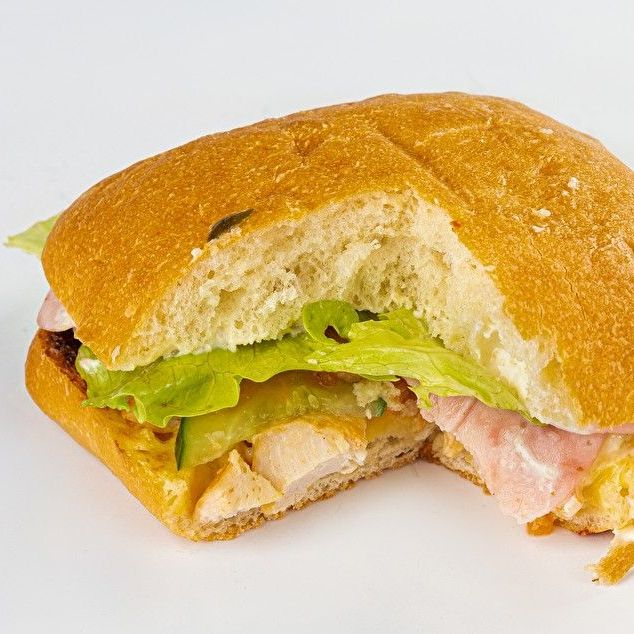 Заказать Чиабатта, ветчина, курица, томат, огурец свежий, салат латук, сыр пармезан, соус чесночный.