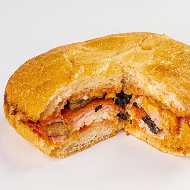 Заказать Чиабатта, соус томатный, сыр моцарелла, ветчина, бекон, пепперони, шампиньоны, маслины, сыр чеддер.