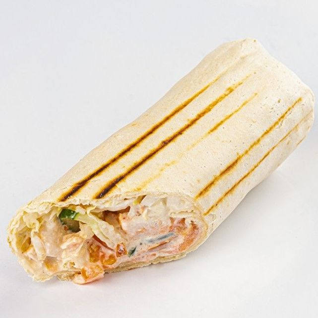 Тортилья, соус чесночный, цыплёнок, пекинская капуста, томат, огурец свежий, лук карамелизированный, соус гриль.
