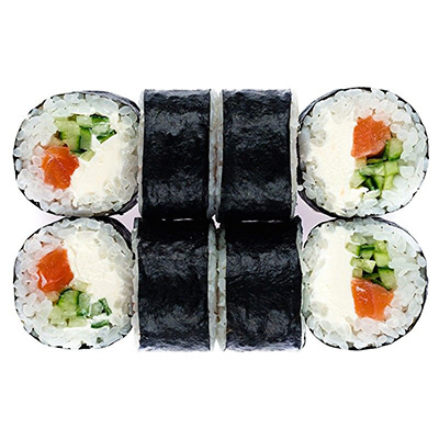 Рис, нори, лосось, сыр филадельфия, огурец.
