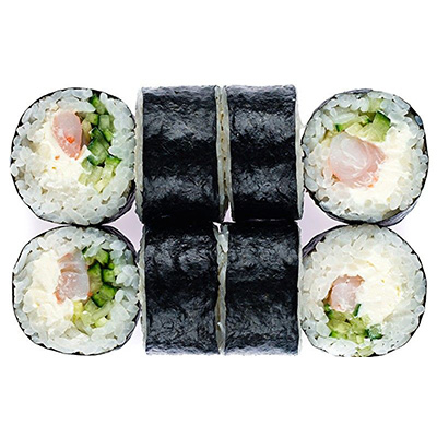 Рис, нори, креветка, сыр филадельфия, огурец.