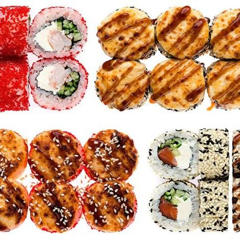 Мурукай 50/50, Магуро 50/50, Лосось 50/50, Томариги 50/50 (классический/запеченный).