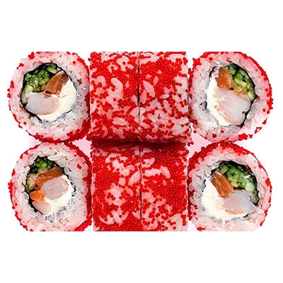 Заказать Рис, сыр филадельфия, лосось, креветка, огурец, икра масаго.