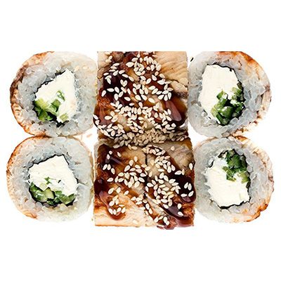 Рис, нори, угорь, сыр филадельфия, огурец, соус унаги.