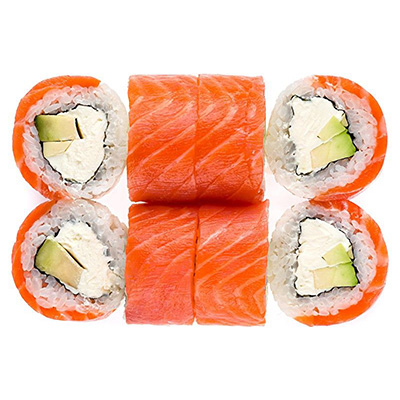 Рис, нори, лосось, сыр филадельфия, авокадо.