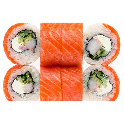 Заказать Рис, нори, лосось, креветка, сыр филадельфия, огурец.