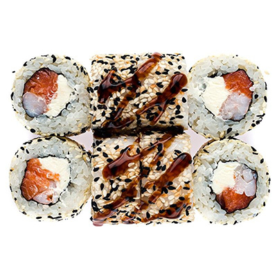 Заказать Рис, нори, лосось, креветка, сыр филадельфия, соус унаги, кунжут.