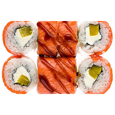 Заказать Рис, нори, лосось опаленный, сыр филадельфия, дайкон, соус унаги, кунжут.