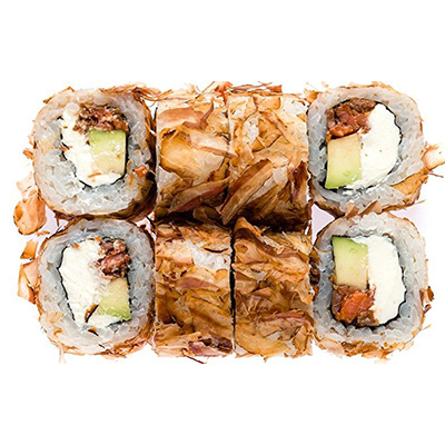 Заказать Рис, нори, лосось терияки, сыр филадельфия, авокадо, стружка тунца.