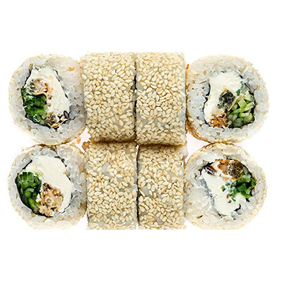 Рис, нори, лосось, креветка, сыр филадельфия, соус унаги, кунжут.