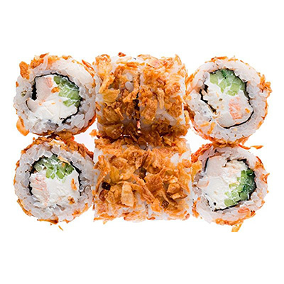 Заказать Рис, нори, цыплёнок, сыр филадельфия, огурец, лук карамелизированный.