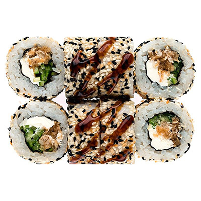Заказать Рис, нори, окунь терияки, сыр филадельфия, огурец, кунжут, унаги соус.
