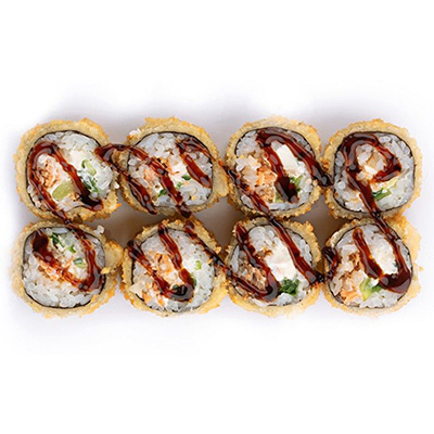 Темпура, рис, нори, лосось, сыр филадельфия, огурец.