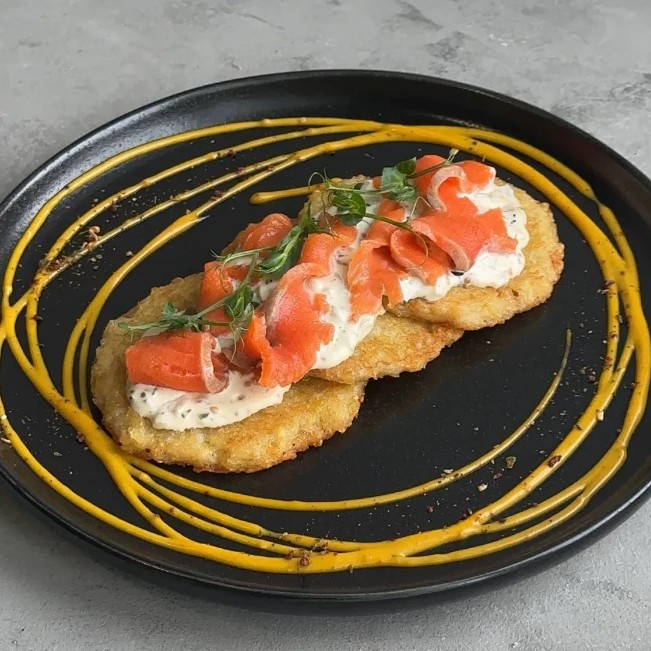 Заказать Драники, лосось, соус Цезарь, огурец маринованный, французская горчица, лимон.