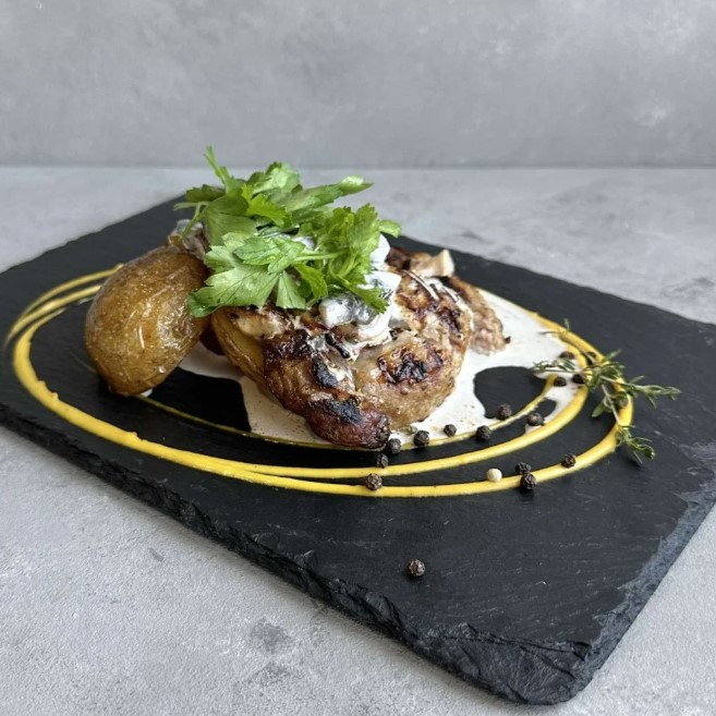 Заказать Стейк из свиной шеи с запеченным картофелем и грибным соусом, FRESCO