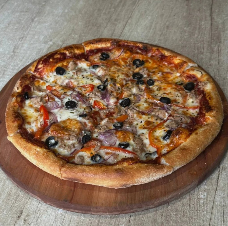 Сыр Моцарелла, тунец консервированный, соус томатный, болгарский перец, лук красный, маслины.
