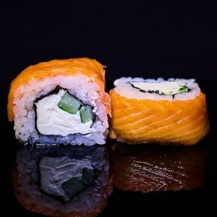 Заказать Рис, нори, сыр творожный, лосось, огурец, карамель.