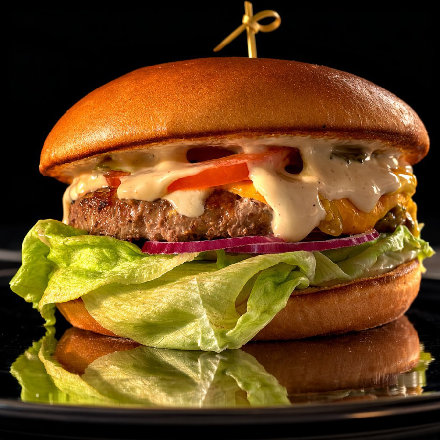 Булочка бриошь, сырный чили, айсберг, фри, котлета, чеддер, томат, огурцы маринованные, соус ранч.