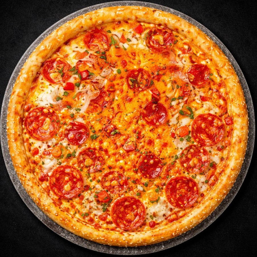 Тесто для пиццы, с-с чесночный, сыр моцарелла, пепперони, грудинка свиная, перец, перец халапеньо, чесночное масло, перец кайенский, с-с чили.