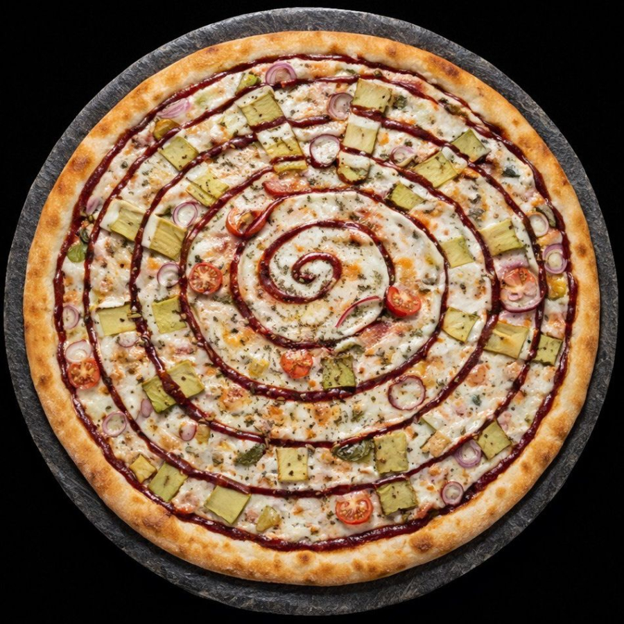 Тесто для пиццы, с-с мутти, сыр моцарелла, лук св, грудинка свиная, колбаски BBQ, шампиньоны, огурцы маринованные, с-с ранч, с-с BBQ, чесночное масло, базилик.