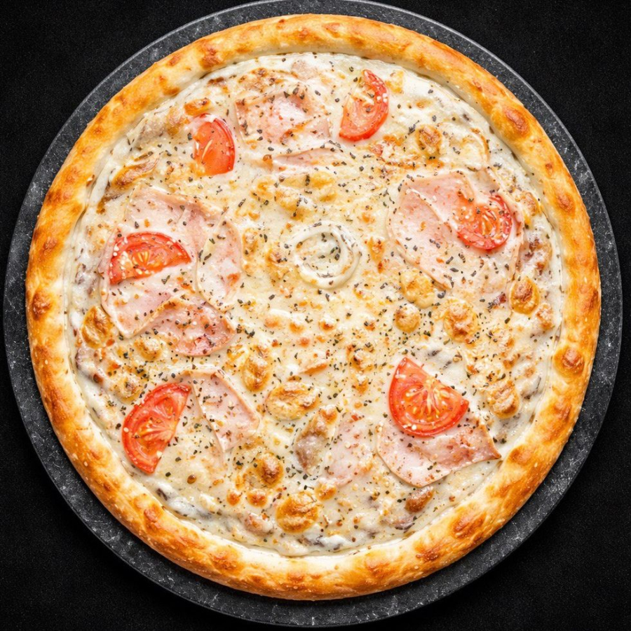 Тесто для пиццы, с-с ранч, сыр моцарелла, филе куриное отварное, ветчина, томат свежий, с-с ранч, чесночное масло, базилик.