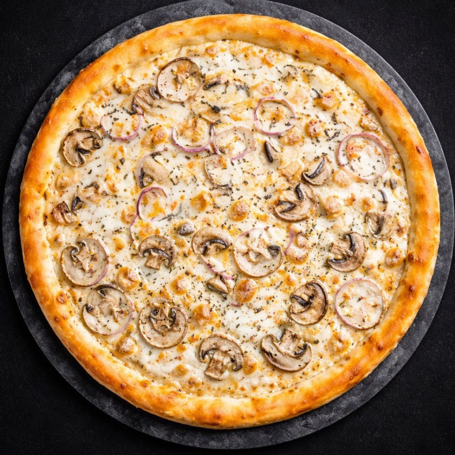 Тесто для пиццы, с-с грибной, сыр моцарелла, филе куриное, лук свежий, шампиньоны, чесночное масло, базилик.