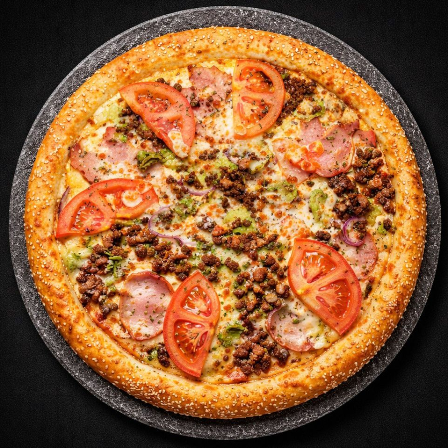 Заказать Тесто для пиццы, соус гриль, сыр моцарелла, лук, фарш говяжий, грудинка, салат айсберг, томат, кунжут, базилик, чесночное масло.