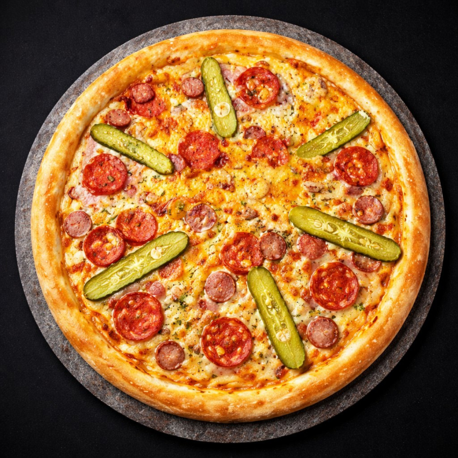 Заказать Тесто для пиццы, соус бургер, сыр моцарелла, грудинка, пепперони, колбаски BBQ, огурцы маринованные, чесночное масло, базилик.