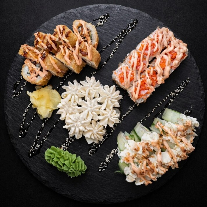 Мини крем ролл с крабом, темпура снежный краб, Бонито тартар из креветки, грин ролл.