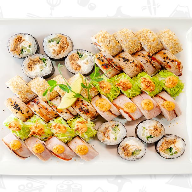 1.Ролл с лососем, сливочным сыром, авокадо и огурцом 2.Ролл в креветке со сливочным сыром, огурцом и авокадо 3.Ролл с жареным лососем сливочным сыром, авокадо и хлопьями копченого тунца 4.Ролл с лососем, икрой Тобико, сливочным сыром, огурцом, луком зелёным 5.Ролл с опалённым морским окунём, сливочным сыром, лососем, черным перцем, яблоком, Сладким соусом чилиПроизводитель: ООО "Фьюжн суши"