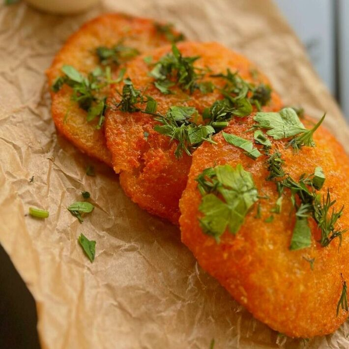 Драники 3 шт, яйцо, сметана, укроп, петрушка.