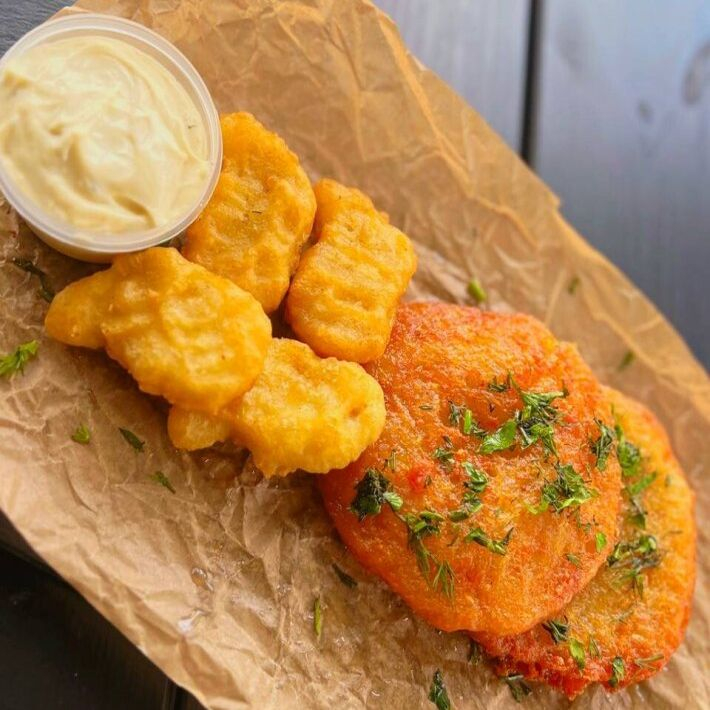 Наггетсы 4 шт, драник 2 шт, сметана.