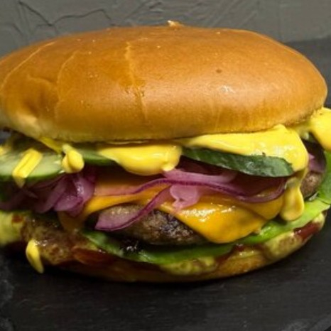 Булочка, говяжий фарш, кетчуп, лук маринованный, огурец свежий, сыр чеддер, сырный соус, горчица.