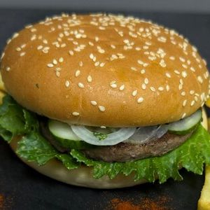Булочка, говяжий фарш, лук маринованный, помидор, сыр чеддер, салат сезонный, соус тейсти.
