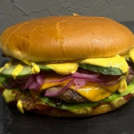 Булочка, говяжий фарш, лук маринованный, помидор, сыр чеддер, салат сезонный, соус тейсти.