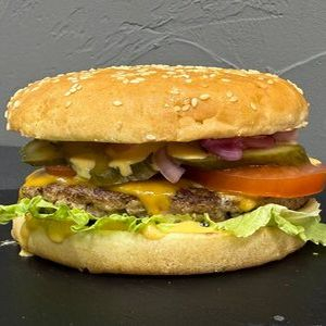 Булочка, говяжий фарш, соус фирменный, лук свежий, огурец маринованный, сыр чеддер, помидор, салат сезонный.