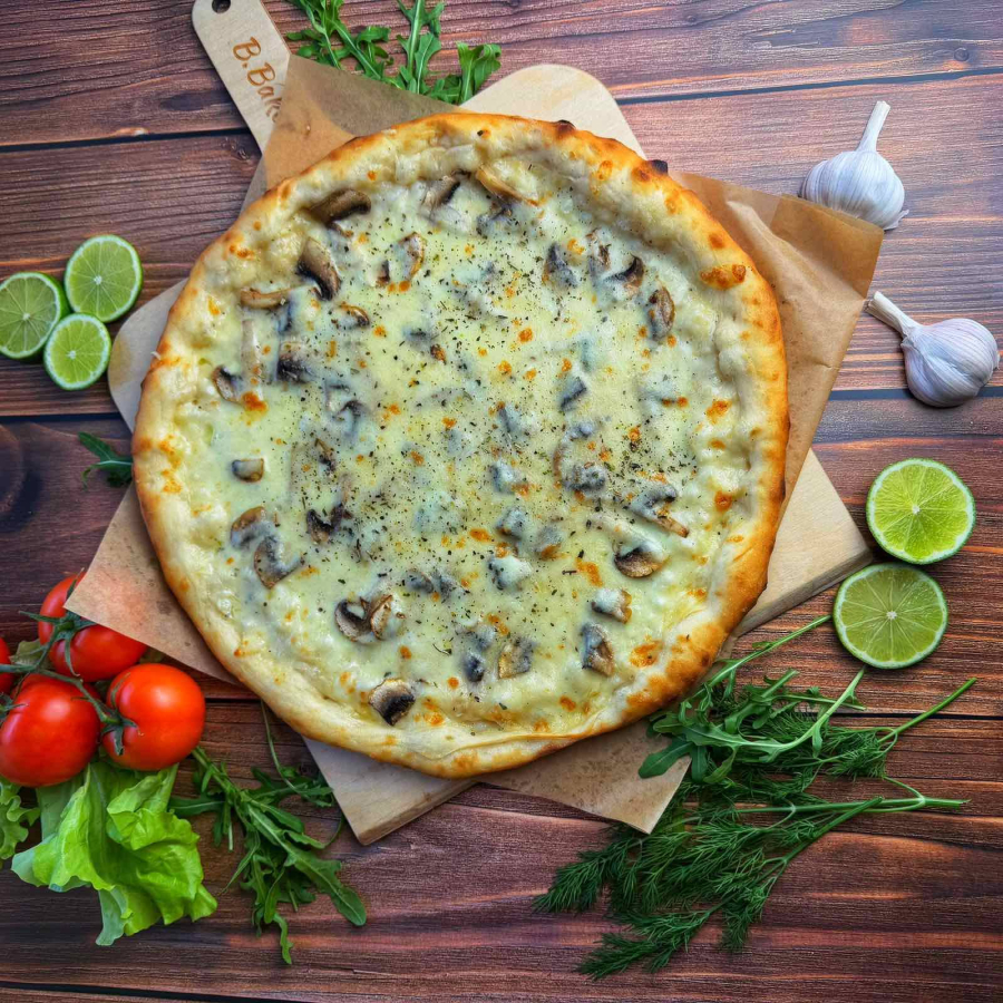 Соус сливочный, сыр моцарелла, грибы шампиньоны, масло чесночное, прованские травы.