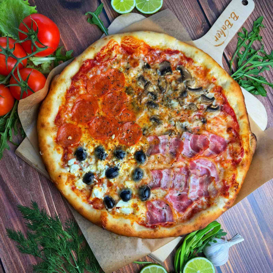 Соус томатный, сыр моцарелла, грибы шампиньоны, бекон, маслины, сыр фета, пепперони, масло чесночное.