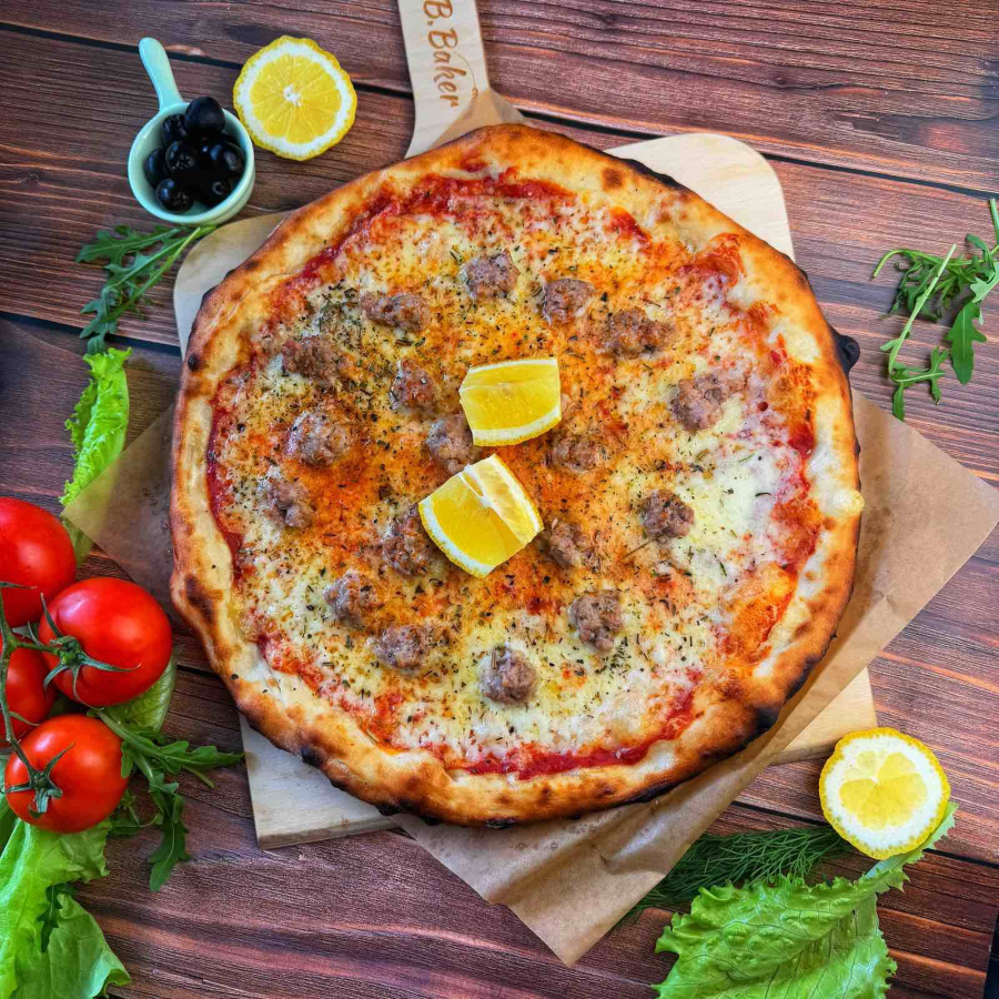 Соус томатный, сыр моцарелла, фрикадельки свино-говяжьи, сыр пармезан, прованские травы, лимон, масло чесночное.