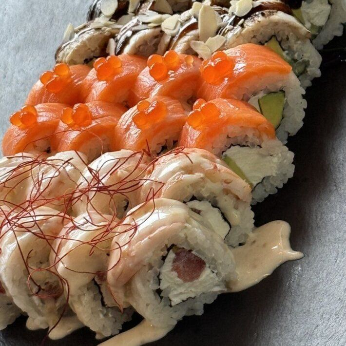 Ролл фила 2 рыбы, ролл гребешок татаки.