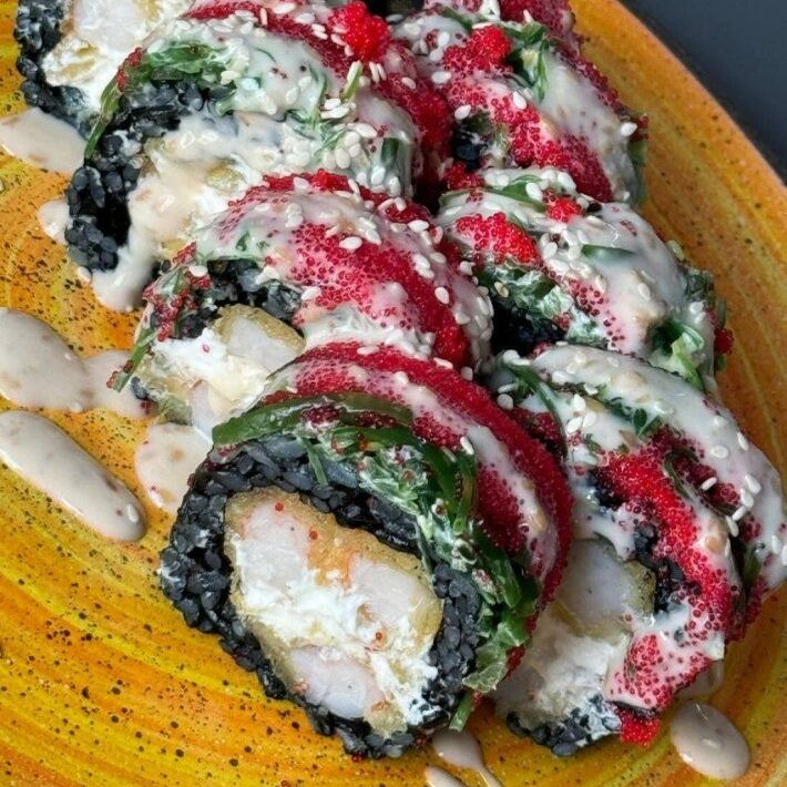 Нори, рис, сыр творожный, креветки в темпуре, чука, тобико, соус кунжутный, кунжут.