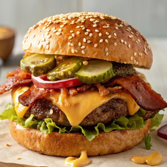 Булочка для гамбургера, говяжья котлета, бекон, сыр, листья салата, огурцы маринованные, помидоры, лук маринованный, соус сырный, горчичный, барбекю.