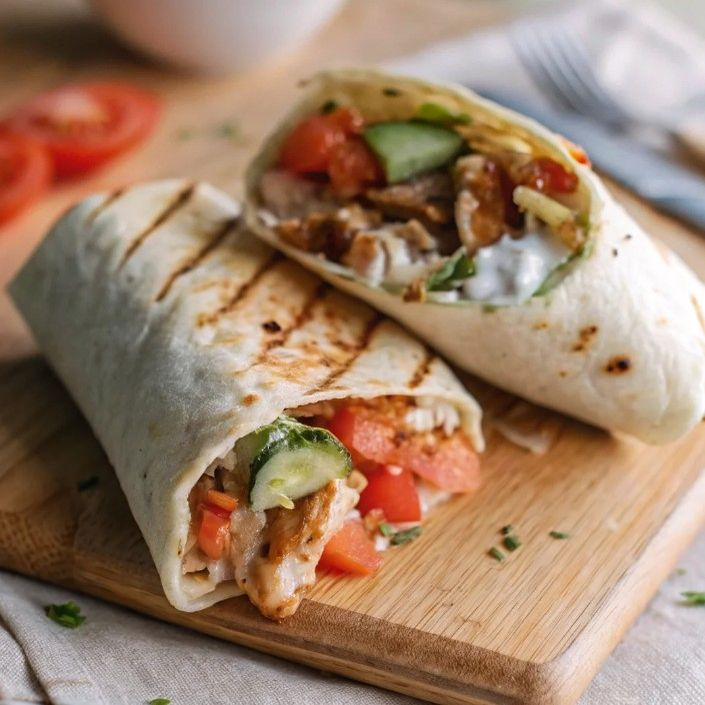 Заказать Лаваш (бездрожжевой), курица (запеченная без масла), помидоры, огурец, пекинская капуста, морковь по-корейский, сыр, фирменный соус на греческой йогурте.