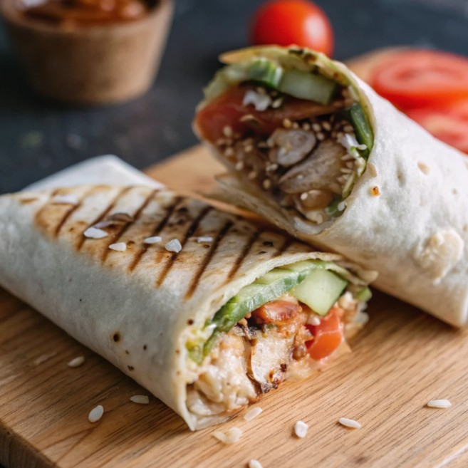 Лаваш, курица, огурец свежий, помидоры, капуста, кунжут, соус Терияки, соус чесночный.