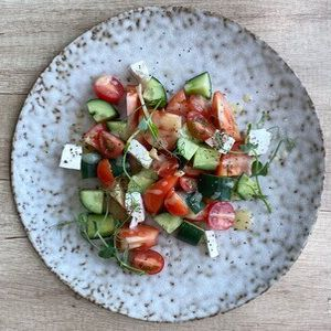 Томаты черри, огурец, томат, сыр фета, горчичная заправка.