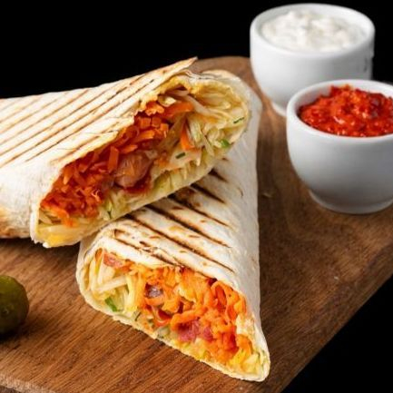 Заказать Лаваш, курица гриль, пекинская капуста, огурец, морковь по-корейски, соус на выбор.