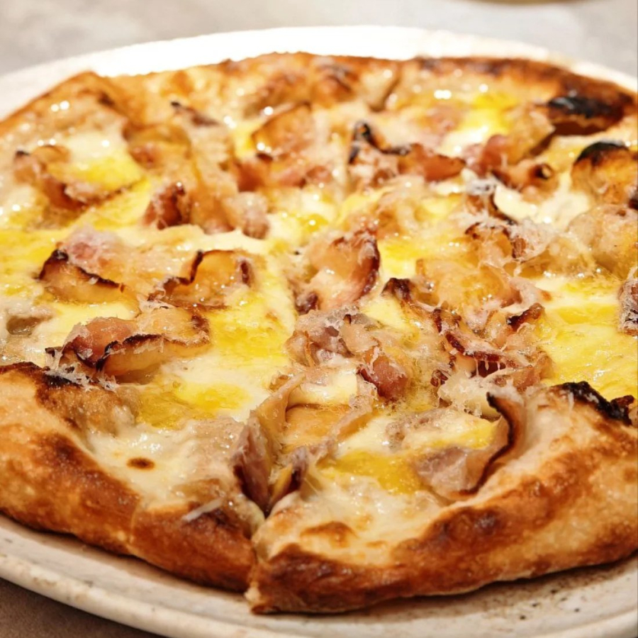 Заказать Тесто для пиццы, соус цезарь, моцарелла, грудинка, пармезан, желток.