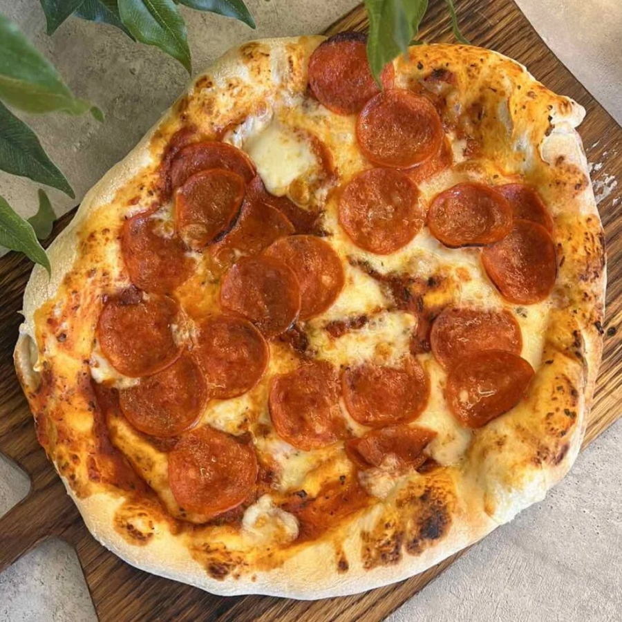 Тесто для пиццы, томатный соус, моцарелла, пепперони, чоризо, колбаски охотничьи, оливки, чили.