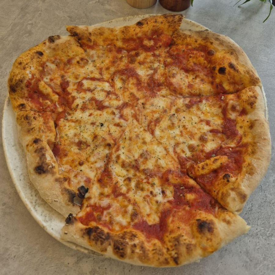 Тесто для пиццы, томатный соус, моцарелла, пепперони, чоризо, колбаски охотничьи, оливки, чили.